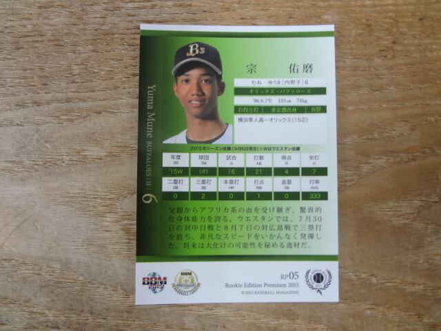 2015 BBM ルーキーエディションプレミアム オリックスバッファローズ 宗 佑磨 RC ( ルーキーカード ) No.RP 05