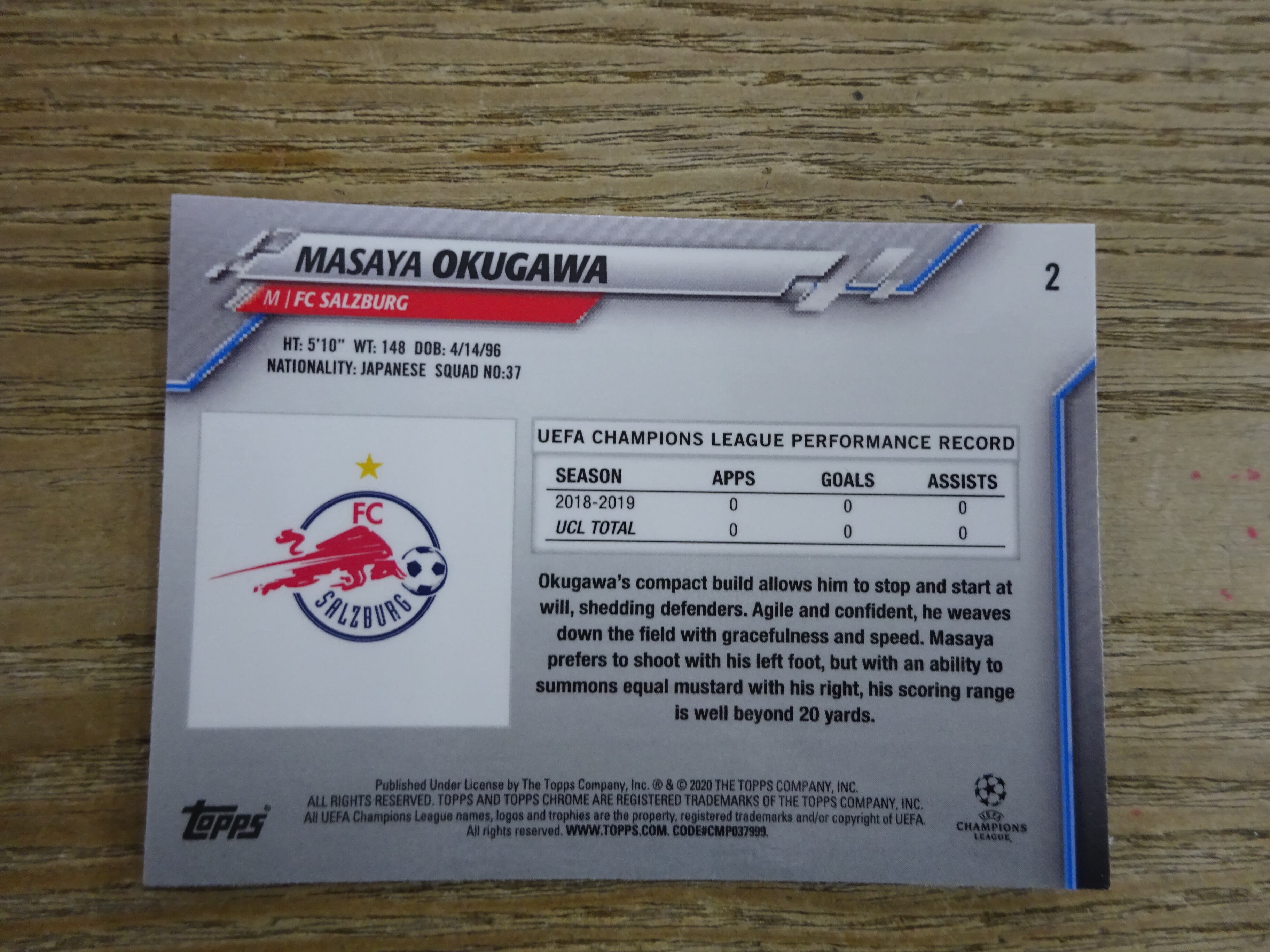 2019-20 TOPPS CHROME UEFA CHAMPIONS LEAGUE レッドブル・ザルツブルク 奥川雅也 NO.2