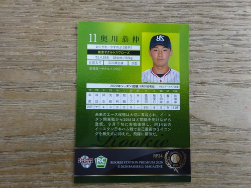 2020 BBM ルーキーエディションプレミアム 東京ヤクルトスワローズ 奥川恭伸 RC ( ルーキーカード ) No. RP 34