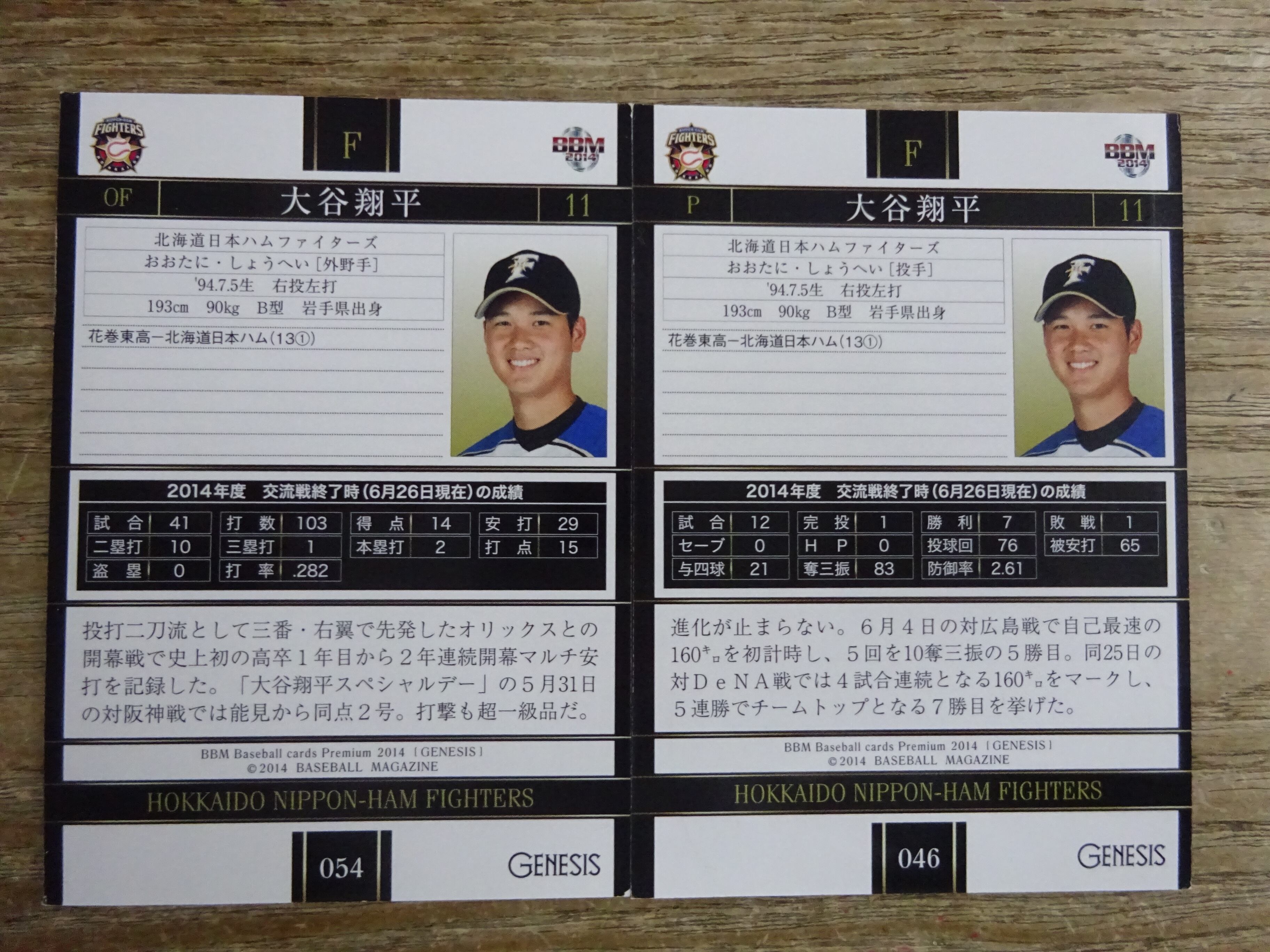 2014 BBM GENESIS 北海道日本ハム ファイターズ 大谷翔平 写真向かって 左側 打者 (バッター) No. 054 右側 投手 (ピッチャー) No. 046